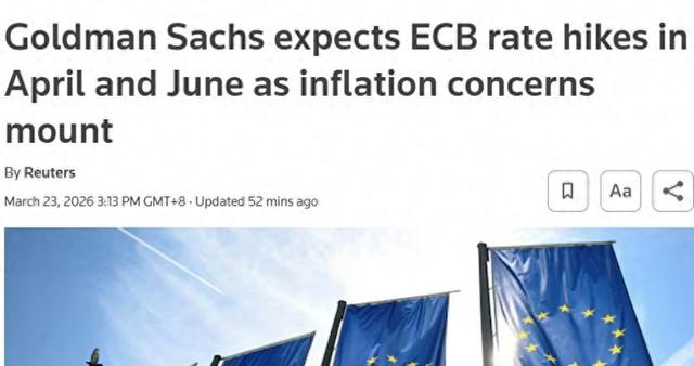 【环球网财经综合报道】据路透社报道,高盛表示,预计欧洲央行将在4月和6月各加息25个基点。此前,摩根大通(J.P.Morgan)和巴克莱银行也做出了类似预期。当前政策制定者正发出信号,称受中东战争影响,通胀风险加剧。